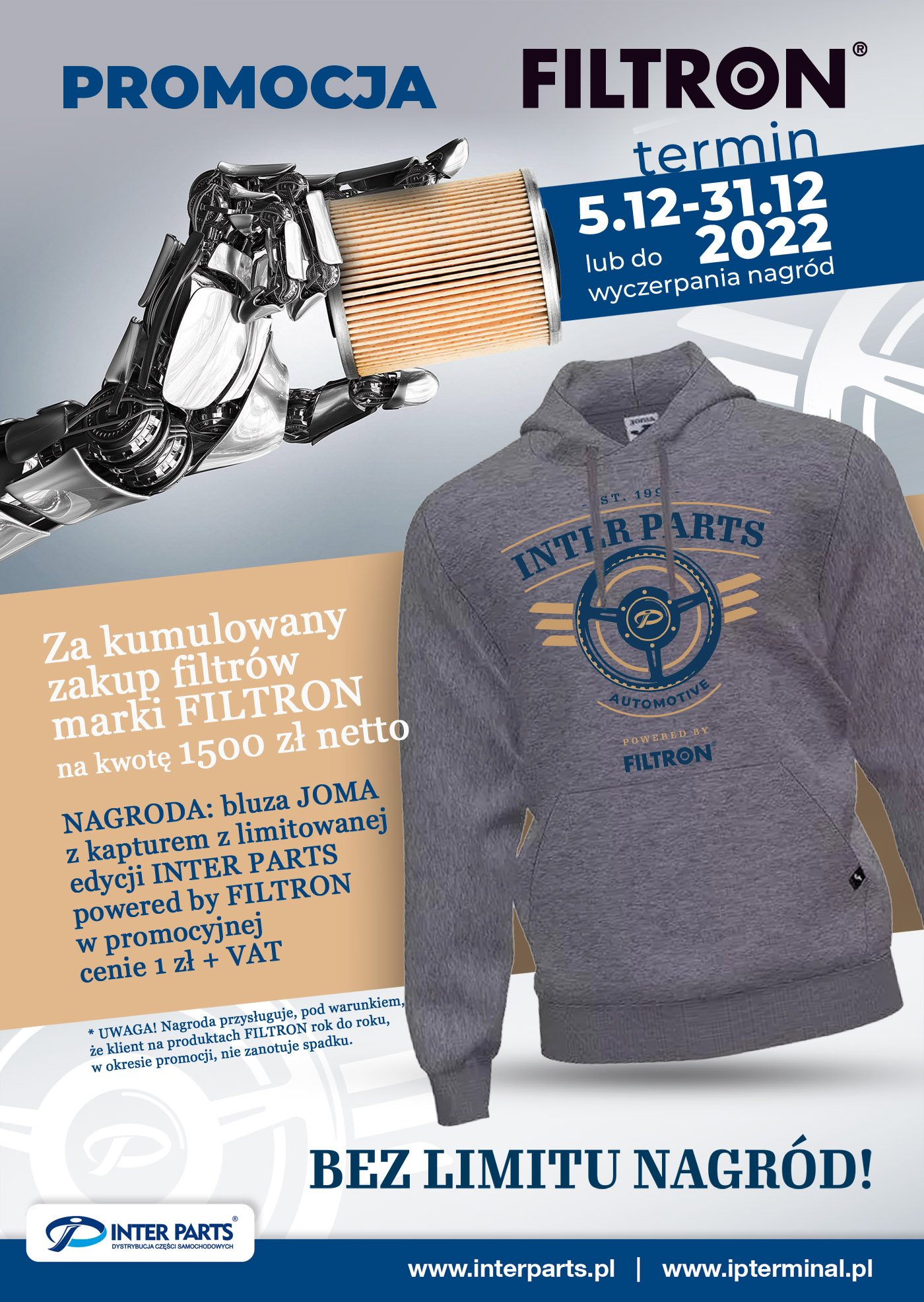 Za kumulowany zakup filtrów marki FILTRON na kwotę 1500 zł netto klient otrzyma nagrodę w postaci bluzy sportowej z kapturem JOMA z limitowanej kolekcji INTER PARTS powered by FILTRON.